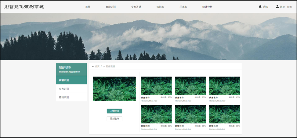點(diǎn)擊左側功能欄“病害識別”或者“蟲(chóng)害識別”或者“植物識別”,顯示如下圖所示。上傳圖片,點(diǎn)擊“開(kāi)始識別”按鈕識別圖片。結果顯示在頁(yè)面右側。