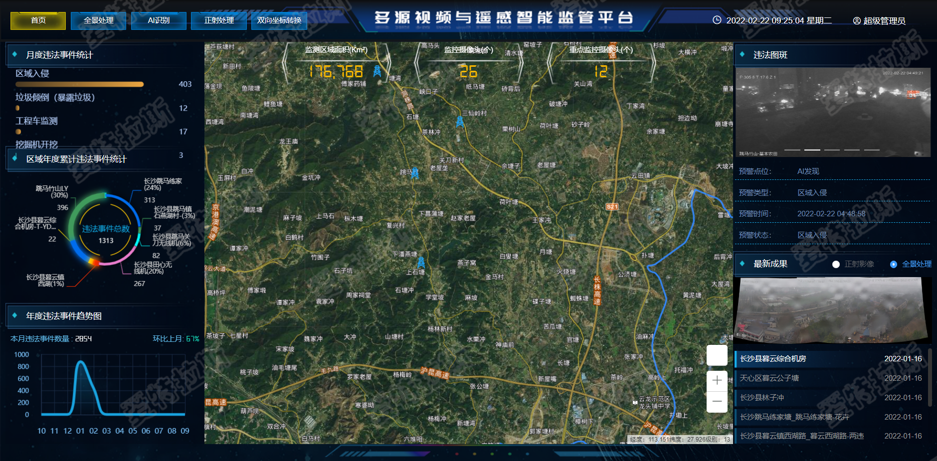 通過(guò)衛星影像傳違法圖斑的上傳,自動(dòng)檢索出對應的攝像頭,輔助查驗違法事件。(具體方法為:針對違法圖斑進(jìn)行樣本采集和深度學(xué)習模型訓練,實(shí)現違法圖斑在視頻中的智能識別;并通過(guò)像地坐標系的轉換,將違法圖斑的位置、時(shí)間投射到相應視頻或監控中,輔助違法圖斑核查)