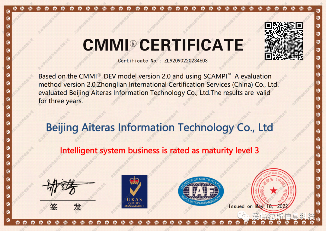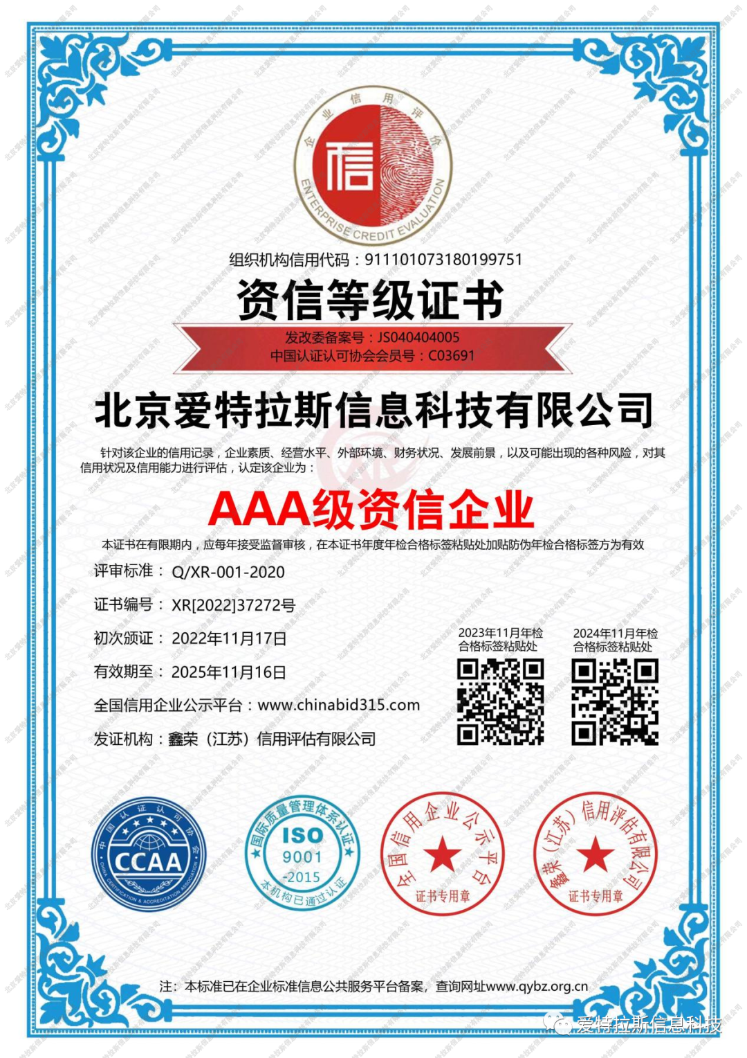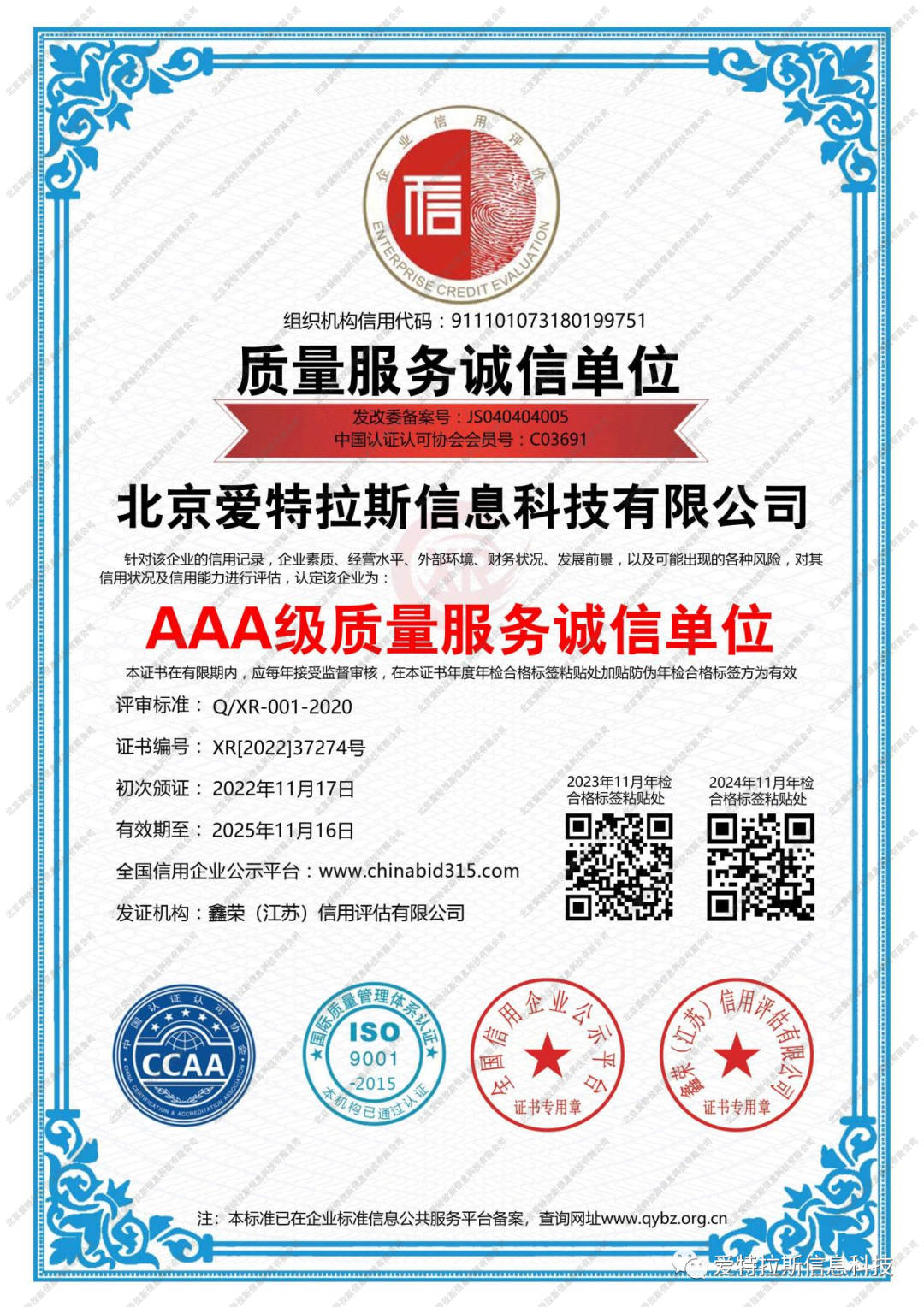 2022年,北京愛(ài)特拉斯信息科技有限公司榮獲ISO質(zhì)量管理體系+ISO信息技術(shù)服務(wù)管理體系+ISO信息安全管理體系認證+CCRC信息安全服務(wù)資質(zhì)認證+知識產(chǎn)權管理體系認證證書(shū)+CMMI3級+AAA級企業(yè)信用認證。