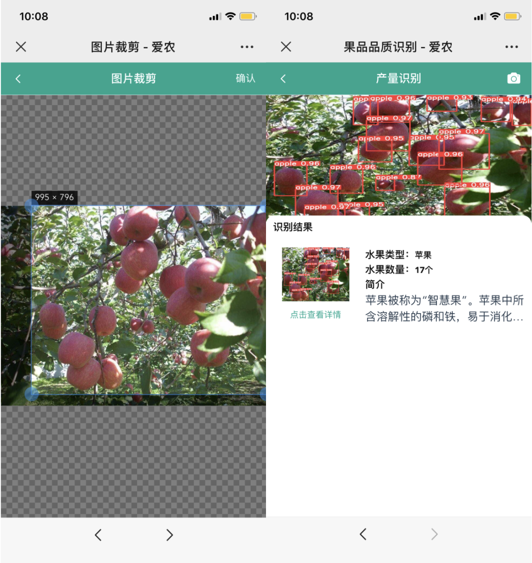 我公司農業(yè)病蟲(chóng)害識別產(chǎn)品迭代升級為“愛(ài)農2.0”版本。此次版本的升級,新增了果品品質(zhì)識別功能、果樹(shù)產(chǎn)量識別功能,完善了樣本庫的擴充,保障了樣本庫及系統的質(zhì)量,提升了病蟲(chóng)害識別精度,加強了功能邏輯合理性。經(jīng)過(guò)多年的智能AI識別技術(shù)、數據分析技術(shù)累積,我公司承建的各農業(yè)相關(guān)項目的成功驗收,符合公司“產(chǎn)、學(xué)、研”一體化的生產(chǎn)運營(yíng)模式,充分體現科技賦能農業(yè)、助理鄉村振興的目標。
